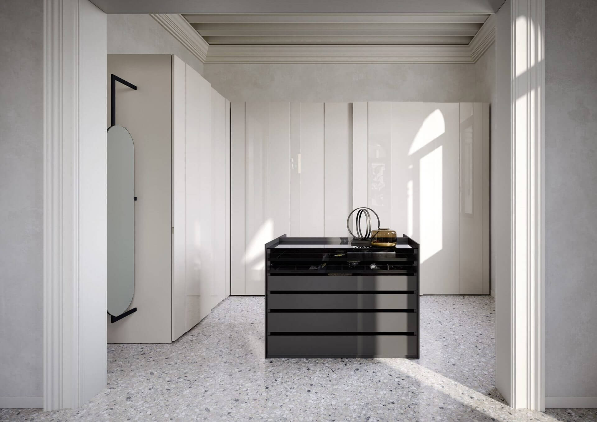 L’élément double face Aristotele anime l’espace dressing en y ajoutant du mouvement et en le complétant avec des solutions de rangement adaptées. Ses lignes fines et épurées créent une harmonie innée, lui permettant de se fondre parfaitement dans la pièce.