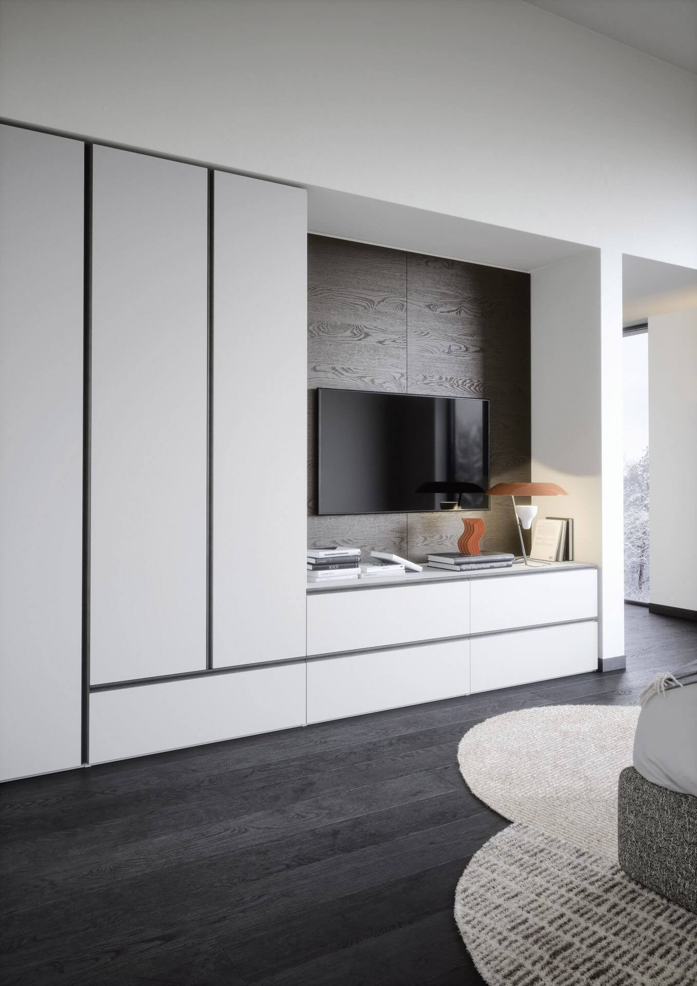 Formes et lignes à la géométrie parfaite pour redéfinir l’organisation de l’espace. Ce modèle sans poignée à portes battantes excelle dans l’art de la symétrie. Gola offre une multitude de possibilités pour créer l’espace de votre choix.